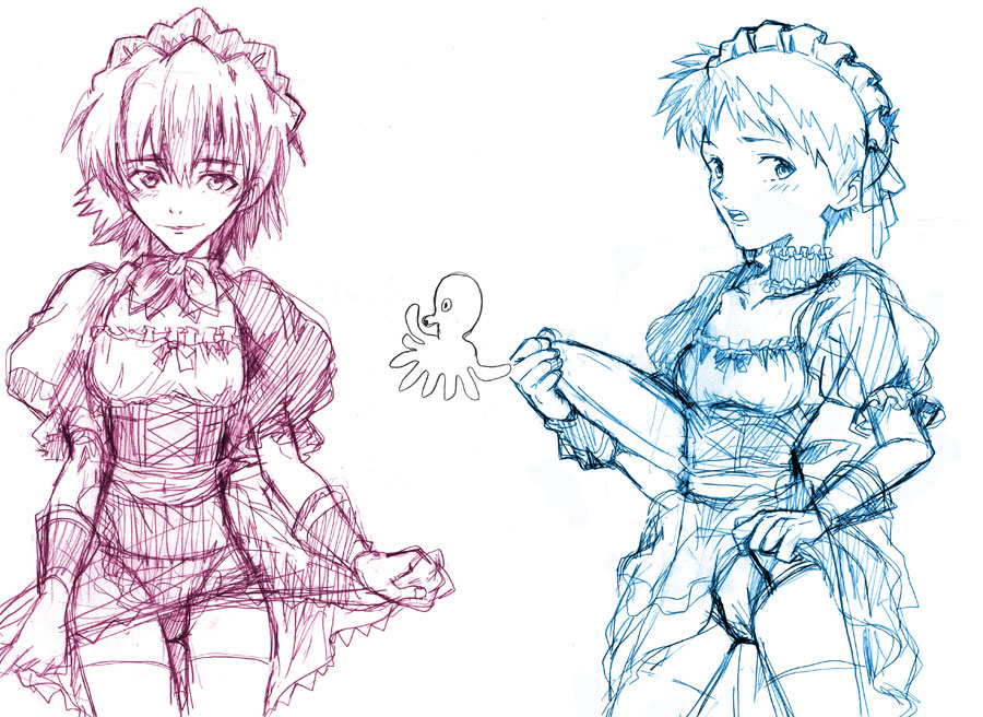 夏に作った本で表紙が普通の格好(?)に対し中がメイドだったのですねとお言葉頂いたの思い出して、カラーで描いた事なかったので今更ながら仕上げてみる事に。たこはおしゃ○イズム見てたときに心理テストしてたんですが、それの名残です。何を調べる問題だったかは番組観てた人が解るんじゃないでしょうか。しかし足の長さ統一感ないw
